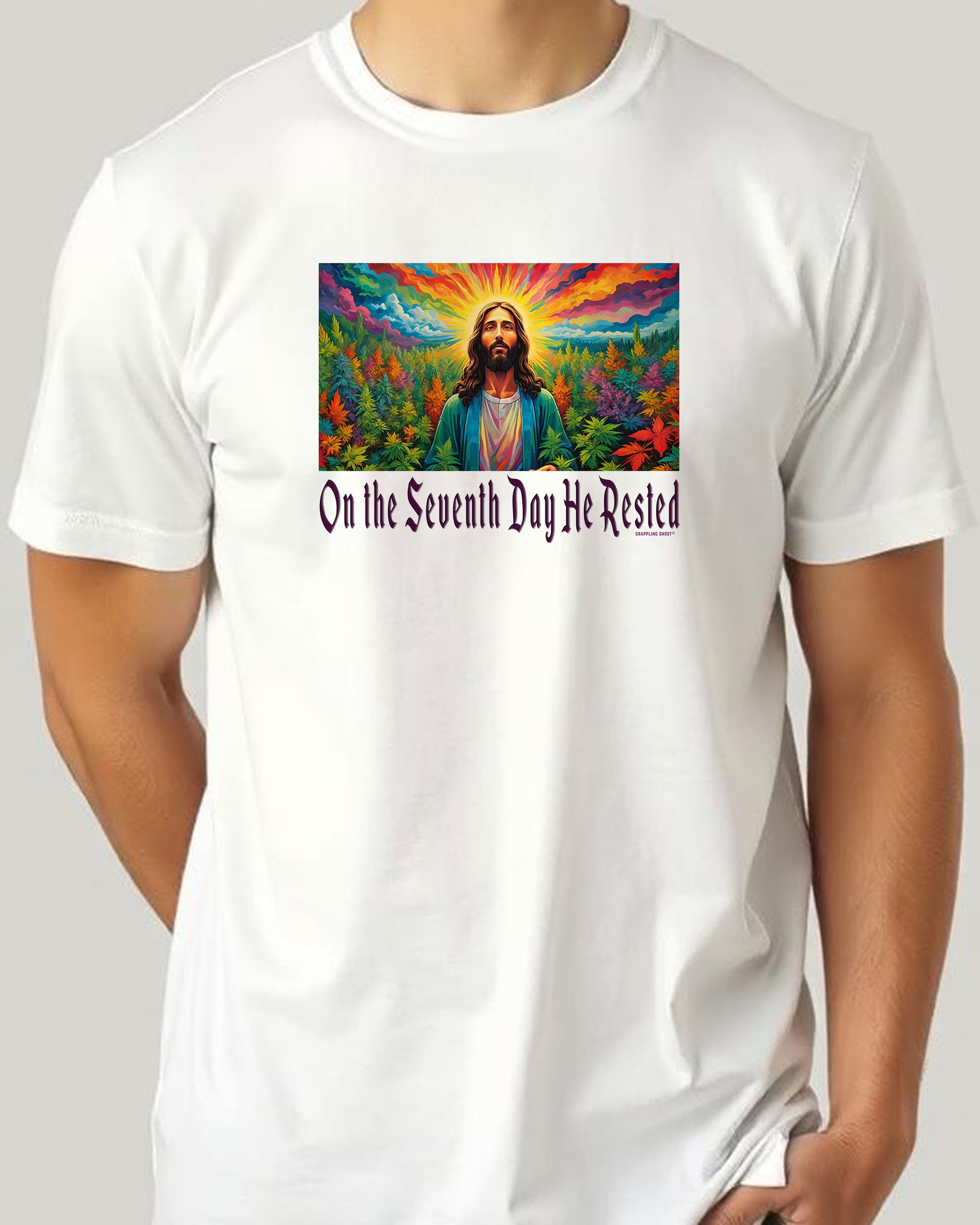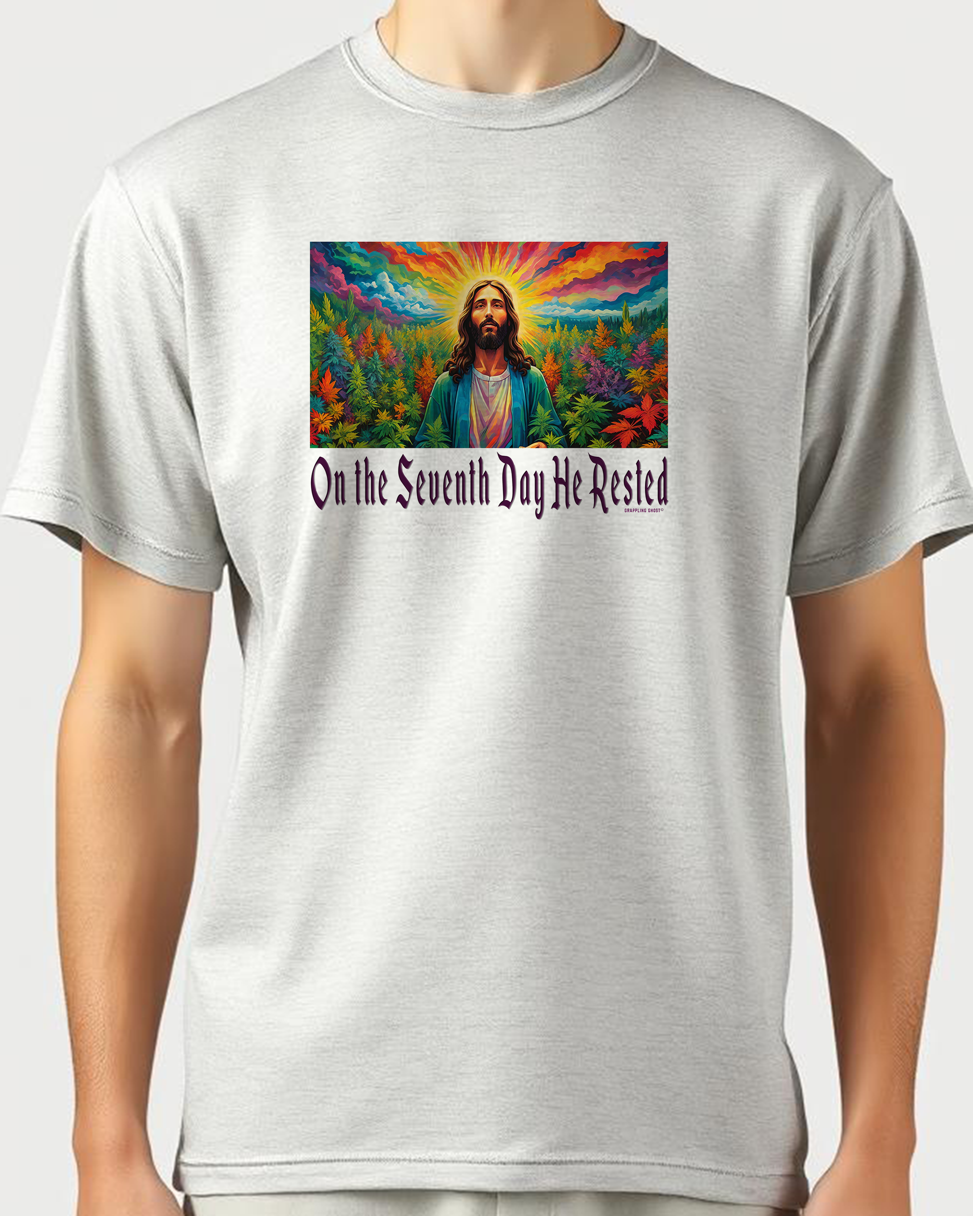 Experience a higher level of inner calm with the He Rested T-shirt. Featuring Jesus meditating in a field of cannabis, this shirt promotes both religious and cannabis acceptance. Embrace the psychedelic colors and spread your love for spiritual and herbal enlightenment.