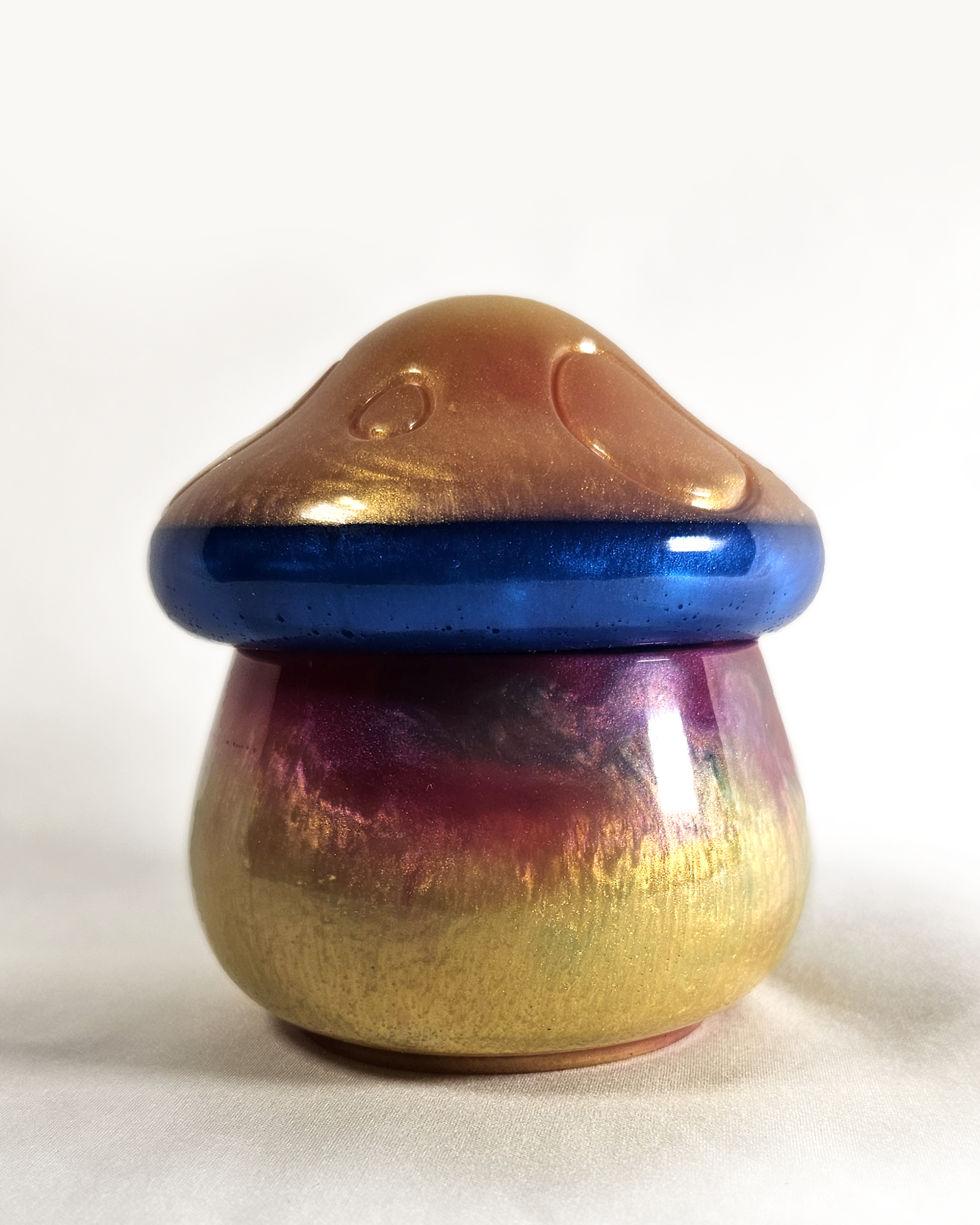 Add a touch of style to your space with the Groovy Mushroom Jar! This unique, one-of-a-kind jar is perfect for holding small items like jewelry, trinkets, D&D dice, or anything else you need to keep organized. The jar features a charming mushroom cap lid that adds a playful, nature-inspired vibe to your home or office. Each piece is hand-designed and individually colored, making no two jars alike. Whether you're looking for a cute storage solution or a fun gift, the Groovy Mushroom Jar is the perfect way to add some groovy flair to your day!
